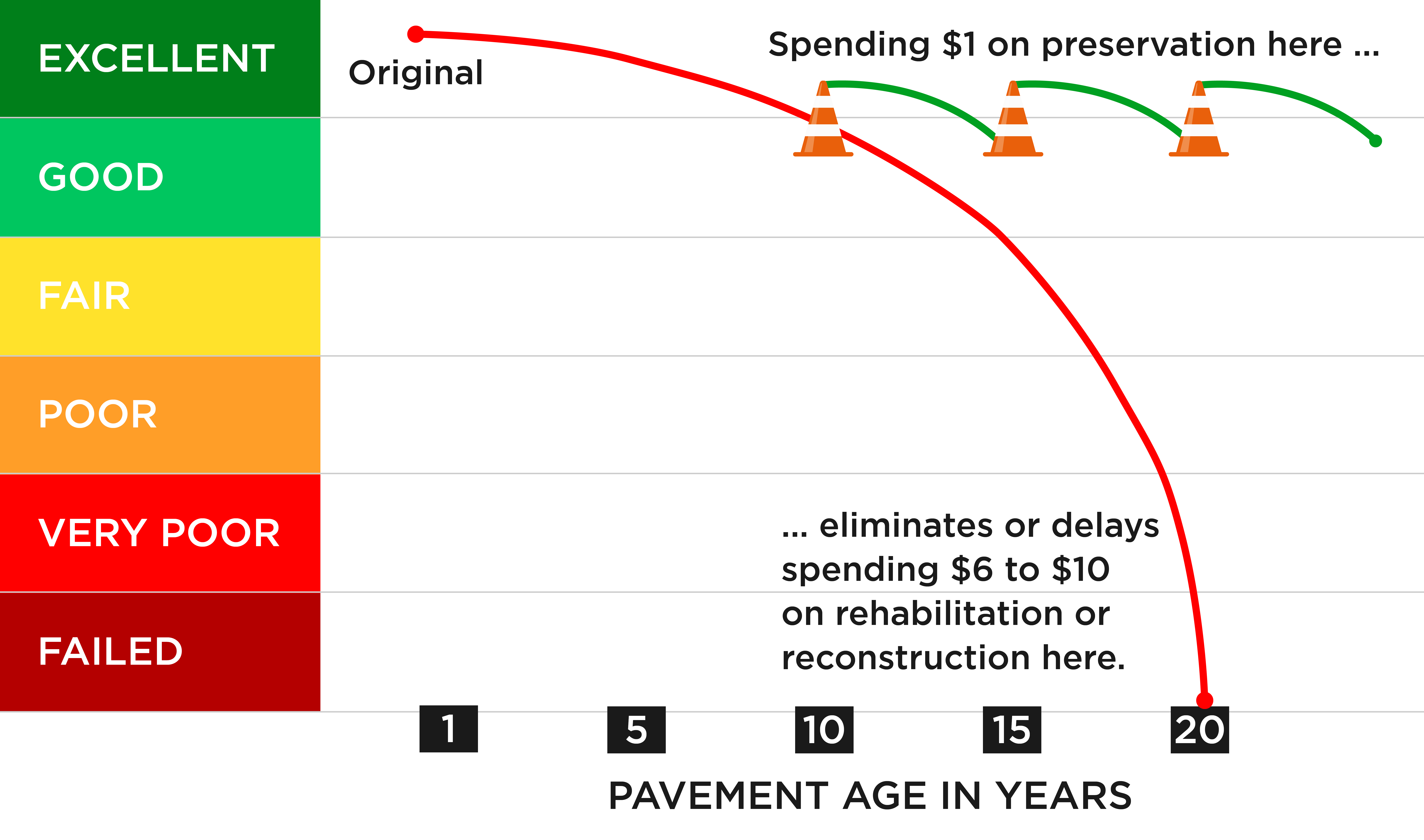Studies have shown that for every $1 spent on pavement preservation while it is in excellent or good condition, $6 to $10 are spent on a pricey rehabilitation or reconstruction when the original pavement falls into a fair condition or worse.